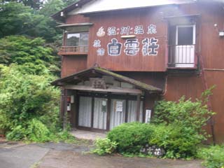 清水バス停で降りて湯川温泉白雲荘に向かいます。日帰り入浴の時間が15時までで、バス停に着いたのが14時51分なので早足で看板の方向に進むと、白雲荘へ下る道があり、建物が見えてくるとカーテンが引いてあり休業のようです。よく見ると日帰り入浴は、川に向かって下ると書いてあり矢印に従って進むと民家がある先に白雲荘の日帰り入浴の目の湯の建物があり、受付で温泉博士8月号を見せると入浴料500円が無料になり、15時の少し前に間に合いました。