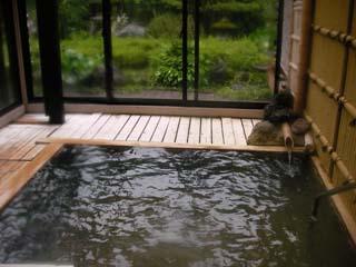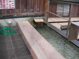 庭の中の階段を上って一段高いところに浴室があり、脱衣場が籠が並んでいるだけで貴重品ボックスはありません。浴室に入ると誰もいなくて、湯船の上に保温のためのシートが浮いていて、横にどけて入ると、奥から源泉が掛け流されていて、やや不透明のぬるめの温泉で、サッシの窓で囲まれていて明るい雰囲気です。よく見ると下から泡が出ていて、ぬるめの湯を加温しています。