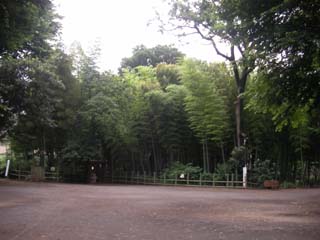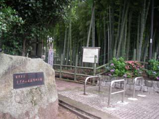 学芸大学駅から東に進み坂を上ると環七を渡り、目黒駅へのバス通りの桜並木を下ったいくとアジサイが咲いている緑地があり、すずめのお宿緑地公園に着きました。園内に入ると広い敷地に竹林があり遊歩道が続いていてタケノコ採取禁止の看板があり、反対側には江戸時代の古民家が建っていて公開されているので中に入ると真っ暗で、かまどのある土間と、黒光りした板の間があり、周囲は住宅地ですが、ここだけ別空間になっていました。