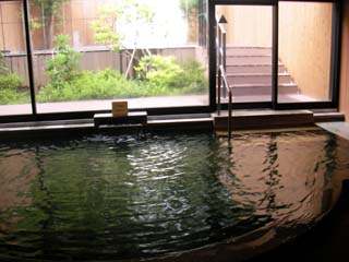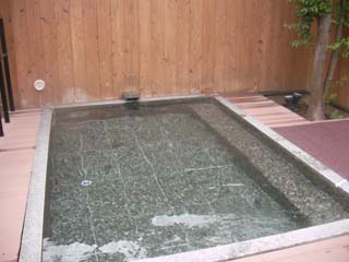 浴室に入ると広い湯船があり、以前入った仙石原温泉と同じくやや白濁した源泉が掛流されていてやや熱めで、一段上に、玉砂利を敷詰めた半身浴の湯船があり、こちらはぬるめで長く入っていられます。シャワーで水をかぶって、熱めの湯船に入ると上せ気味で、脱衣場にあるミネラルウォーターで水分補給すると暖かく温泉を使っているようです。