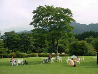 湯上りに隣にある休憩室で、冷たいお茶を飲んで一休みして、ロビーの暖炉と書斎のようなソファーで寛いでから、テラスに出てみると外国人の団体客が思い思いに過ごしていて、芝生の斜面を下って桃源台駅に向かいました。- 旅行時期