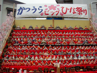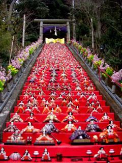 勝浦駅で下車してかつうらビックひな祭りの会場に向かいます。昔ながらの商店街の店頭にひな人形が飾られていて、圧巻は遠見岬神社の参道の階段を雛壇にみたてて雛人形を並べてあります。この日は最終日で生憎の曇り空ですが、なんとか雨が降らずに中止にならずにラッキーでした。