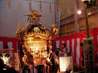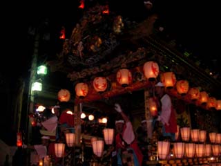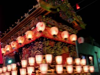 西武秩父駅に着くと駅前から秩父鉄道の御花畑駅に向かう通路は、一方通行の出口で遠回りして秩父駅の方に向かうと広い道に出て、露天が並んでいます。遠くから屋台が近づいてきて人垣の間からでも背の高い屋台がよく見えます。全部で6台の屋台がありますが、やってきたのは中町の屋台で、これから街中を巡って団子坂の御旅所に向かうとこでした。