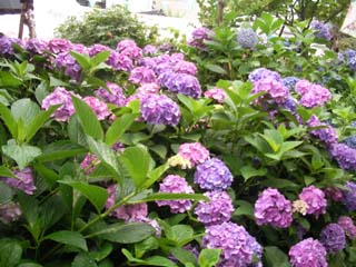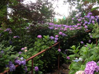三田線の白山駅から白山神社に向かうと文京あじさいまつりの提灯が並んでいます。境内には、色とりどりアジサイが咲いていて、地元の商店街の店も出ています。生憎の雨模様で紫陽花コンサートは中止ですが、水滴でアジサイ色合いが鮮やかに見えています。