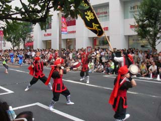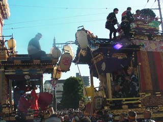 市役所前に戻ってみると、2台の山車が舞台を向け合って、狐とお多福が鐘と太鼓に合わせて踊る「曳っかわせ」をやっています。近くで見ると、どちらも相手に負けずにお囃子のリズムを変えずに叩き合って、大音量で白熱しています。