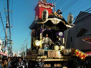 曳っかわせが終わると、舞台の方向を変えて別方向に向かいますが、山車の車輪の方向を90度変えるのに、一度ジャッキアップして、大勢で方向転換しています。以前、高山祭りに行ったときは、梶付の山車で、飛騨の匠の技だと聞いたことがあります。