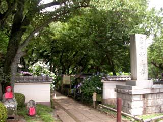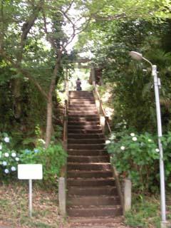 白山神社の拝殿の裏にまわるとあじさいまつりに合わせて富士塚が公開されています。鳥居をくぐってアジサイに囲まれた階段を登ると山頂で祠があり、高さが5メートル以上あり、反対側な低くなっていて高く感じます。江戸時代の切絵図には、白山神社に富士山が描かれていますが、一度廃棄され戦後に公園整備に合わせてアジサイのある富士塚になったようです。