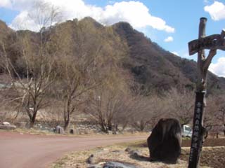 岩井堂観音から吾妻川の対岸を見ると広い駐車場と運動場が広がり温泉施設の桔梗館が見えていますが、上流にある対岸に渡る舟渡大橋まで交通量の多いわりに歩道のない国道を歩かなければなりません。橋を渡って対岸に出ると、川沿いに吾妻川自然歩道が続いていて、途中に公園や東屋があり快適な散歩道になり、台風の大水で崖が崩れた台地の上に小さな甌穴や、昔の賭博場の跡を通って広い公園に出ました。公園の看板を見ると、上流に建設中止で問題になっている八ッ場ダムがあり、電源立地地域対策で整備されたようです。