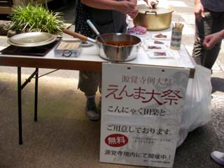 文京シビックセンターの前から北に少し行ったところに「こんにゃくゑんま」と書かれた石碑がある源覚寺があります。参道を進むと奥に閻魔堂があり、こんにやくが供えられています。