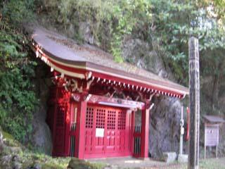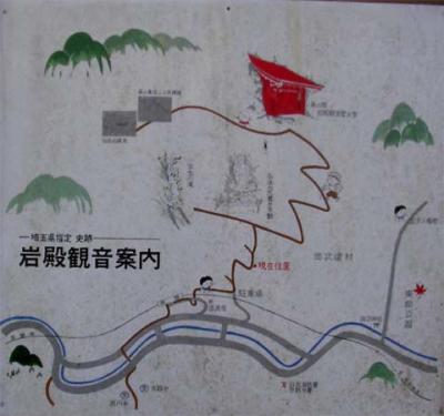 法光寺から線路を渡った先の沢に沿った道を進むと、だんだんと急になってジグザグに登っていくと、小さな洞窟があり「弘法の爪書き不動」の説明があり、よく見ると岩にうっすら磨崖仏があり、反対側は滝になっています。さらに登ると朱塗りの岩殿観音があり、横の扉を開けて入ってみると、洞窟の中に観音像があり、石灰岩の洞窟を利用しています。