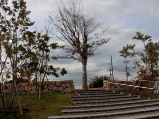 台地の上に出ると亀塚公園で、一段高いところが亀塚古墳で、階段を上ると石碑が建っています。今はビルに囲まれていますが、昔は海に面した高台の上の見晴らしがよい場所だったことが想像できます。