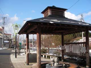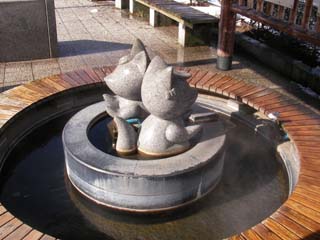 野天風呂湯元龍泉に入った後、村上駅行きのバスの時間まで少し時間があるので、近くにある足湯にい行ってみると、円形の足湯の中央に瀬波温泉のマスコットがあり、石油の採掘時に温泉が湧き出したとのことで、新津温泉ほどではありませんがアブラ臭のする源泉は石油と関係していたのに納得し、バスに乗って村上駅に戻りました。
