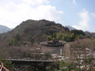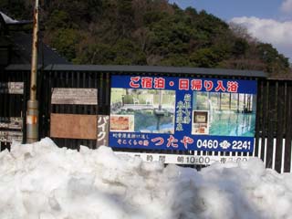 国道1号線から宮ノ下交差点に出て、国道138号線に入ると歩道に雪が積もっていて、この日は大雪の後で路線バスも宮城野で折り返し運転になっており、車道の端を車に注意しながら進むと蛇骨川にかかる橋のたもとに太閤岩風呂の案内板があり、以前夏に宮ノ下の保養所の泊まったときに、豊臣秀吉の小田原攻めに由来するひょうたん祭りをやっていたのを思い出しました。