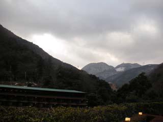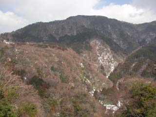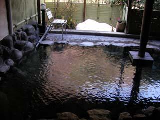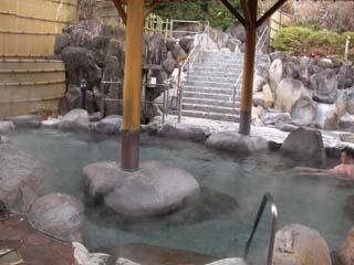 階段を降りると浴室があり先客がいるので、先に反対側にある露天風呂に行ってみると、誰もいない岩風呂に無色透明の源泉が掛け流されていて、温泉はやや熱めで温まってから椅子に座って涼むと谷間に雪が積もった山が見えています。何度から岩風呂に入ってから、いったん服を着て大浴場に戻ると、内湯は楕円形の湯舟の周囲にカランが並んでいてこちらもやや熱めの温泉でした。
