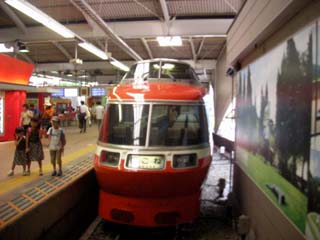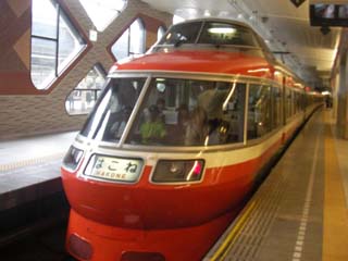 新宿駅発の特急ロマンスカーはこね号で箱根湯本に向かいます。ロマンスカーといえば、伊豆や箱根への旅行の定番で、本数が少なくなりましたが運転席が二階にあり先頭と最後尾に展望室があり、ミュージックホーンを鳴らしながら走っています。