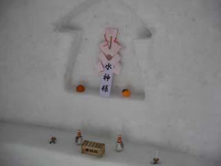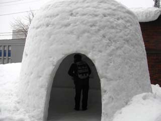 雪がの残っている歩きにくい道を進み、広い道路に出てさらに進むと「かまくら館」があり、観光案内所の事務所があり、隣は横手市役所です。裏手にまわると背丈以上あるかまくらがあり、中に入ってみると、水神様が祭ってあり、これだけの大きさになると作るのも大変そうです。帰りは行きとは違った道を通り横手駅に戻りました。