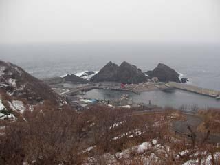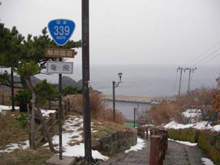ホテル竜飛崎の温泉に入った後、折返しのバスの時間までまだ30分ほど時間があり、周囲には廃業したレストハウスがあるだけで、展望から下っていく道に雪が積もっていないので、漁港まで下っていくことにします。降りるにつれて階段になり雪が積もっていますが、山靴を履いていったので問題なく下っていけます。途中に国道399号線の標識があり、階段が国道に指定されています。