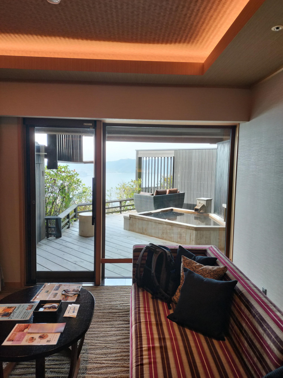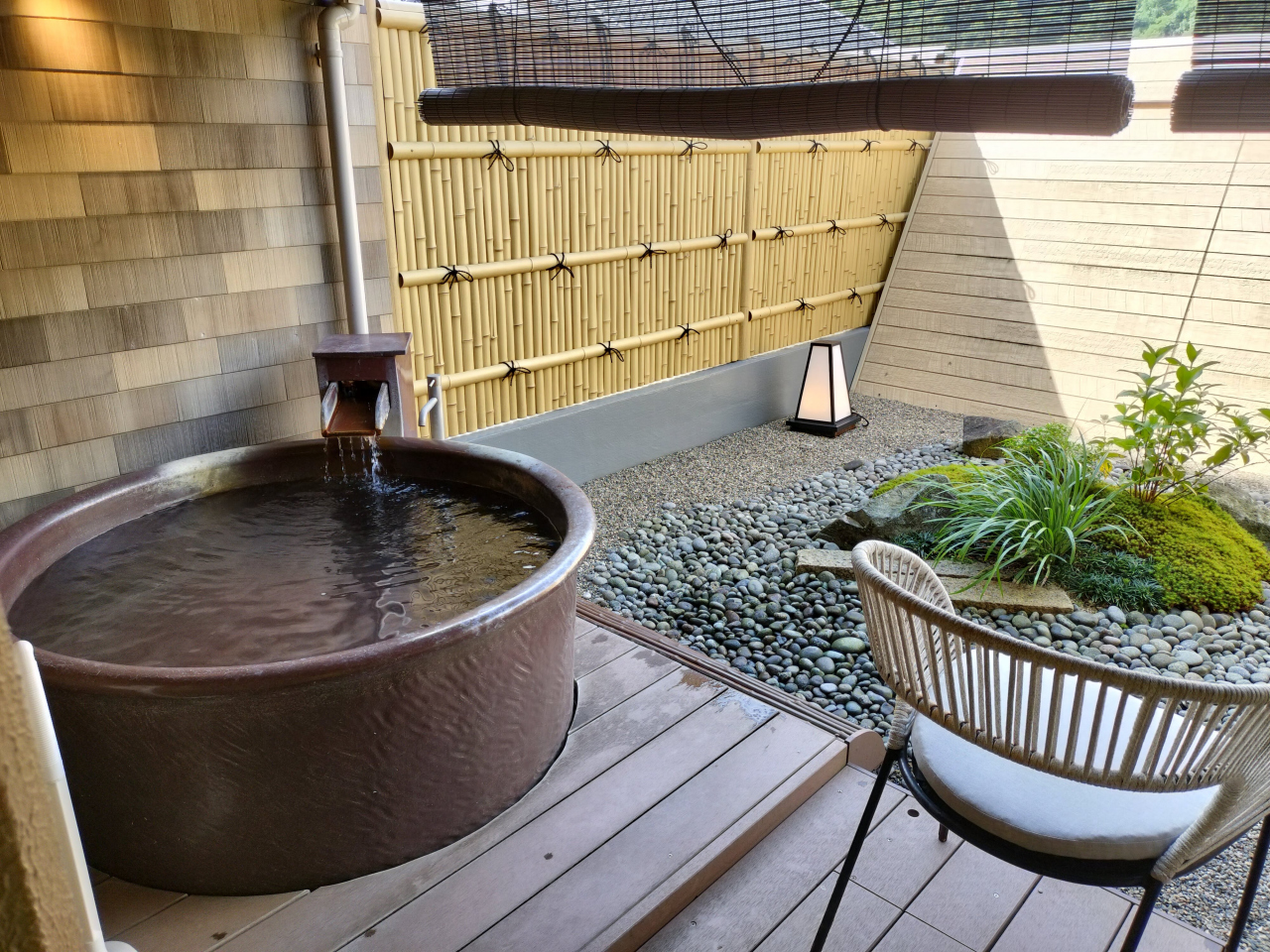 リニューアルされ、部屋に源泉かけ流しの露天風呂がついた和モダンのお部屋に宿泊しました。