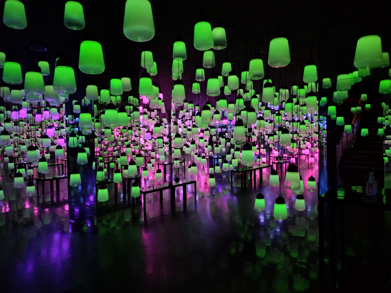 外観はちょっとひく位、古いホテルです。ただ、一歩ロビーに入ると、写真のようにチームラボの幻想的な作品の中に入り込みます。