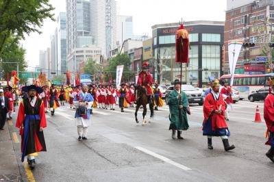 朝鮮王朝時代の衣装で楽隊を先頭に武官や文官そして王様の輿と続きます。行列を通すため車両は完全にシャットアウトされます。