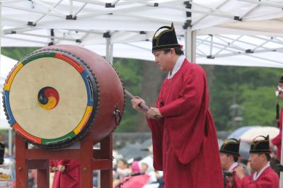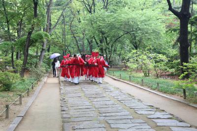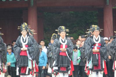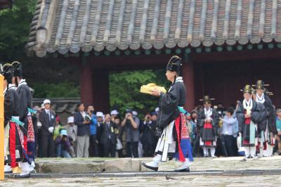 朝鮮王朝時代のいでたちで、当時の政権を執務する景福宮から位牌を祭祀する宗廟まで輿に乗った王様の行列が練り歩く儀式と宗廟において先代王の位牌を祭祀するための舞踊や音楽の儀式に分かれます。