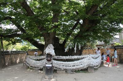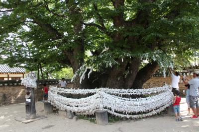安東河回村を散策すると迷路のような路地に入り込みます。丁度、村の中心部付近になりますが、かまわず突き進むと土塀を超えて大きな枝葉が現れます。大きな葉は太陽を遮りここだけヒンヤリ感じ、更に進んでいくと無数の短冊が幾つもの細縄に巻き付けられた大木に遭遇します。