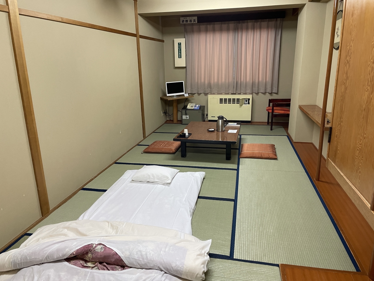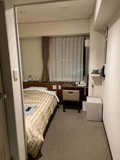 部屋は普通のシングルルームでした。アパホテルよりは広いです。後日別の部屋に泊まりましたが、こちらは和室にシングルベッドが置いてありました。まあ、この辺の宿は昔はみんな和室の旅館だったんでしょうからね。