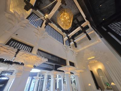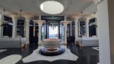 波をイメージしたかのようなユニークな柱やゴージャスなシャンデリアなど、...