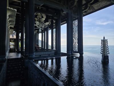 リンウン寺にある高さ67メートルの巨大な観音像、レディブッダを横目に。