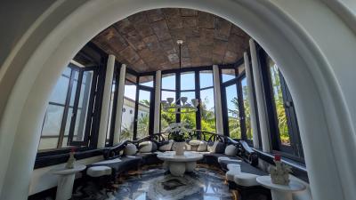 開放的な空間のエレガントなロビー。花手水の向こうには青い海。なんてフォ...