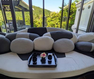 ユニークなソファでウエルカムドリンクをいただきながらチェックイン。翌日...