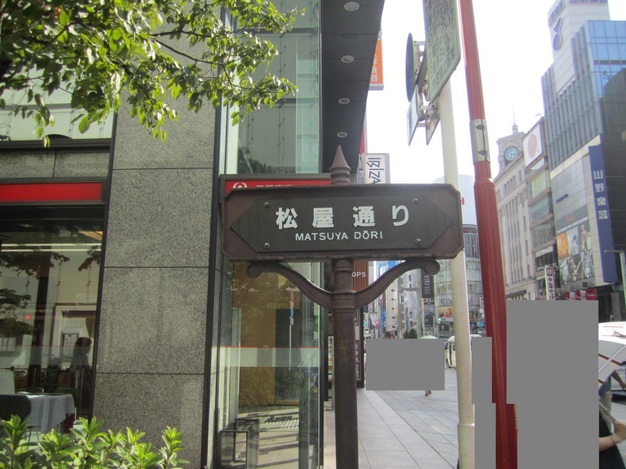 松屋通りは晴海通りの一本松屋側に並行して通っている通りです。裏通りになるのかもしれませんが、デパートの三越と松屋に挟まれた立派な通りですが、車は一方通行のようです。