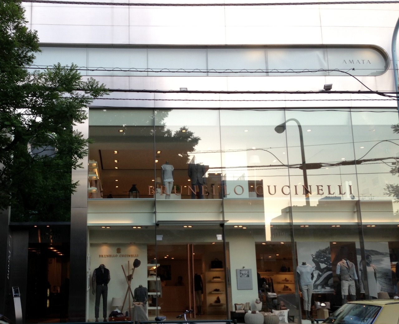 Brunello Cucinelli (青山店)は根津美術館の並びにある美しいカシミアで知られるイタリアのラグジュアリーブランド 「ブルネロ クチネリ」日本最大級の旗艦店です。2009年8月にオープンした総売り場面積300平方メートルの大きなお店です。大きなガラス 張りのお店です。