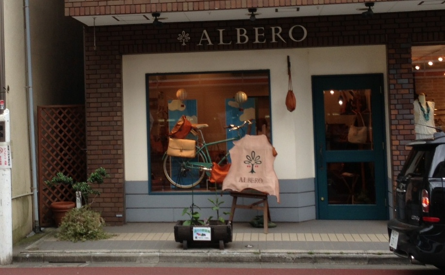 ALBERO アルベロ (自由が丘店)は、東急自由が丘駅から少し歩いたところ、自由が丘通り沿いにある皮製品のブランドALBERO アルベロのお店です。使い込むほど飴色へと表情が変わるイタリア製白ヌメ革のNATURALEシリーズの品物ガ有名です。
