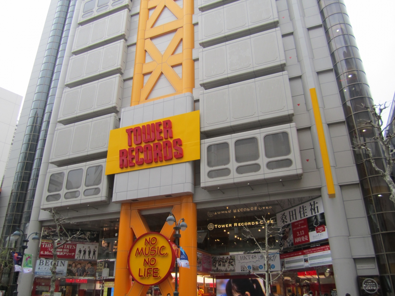 タワーレコード (渋谷店)は渋谷駅から神南郵便局前交差点方面に歩いたところにあります。黄色いビルで目立ちます。ミニライブやサイン会が行われている広いショップです。