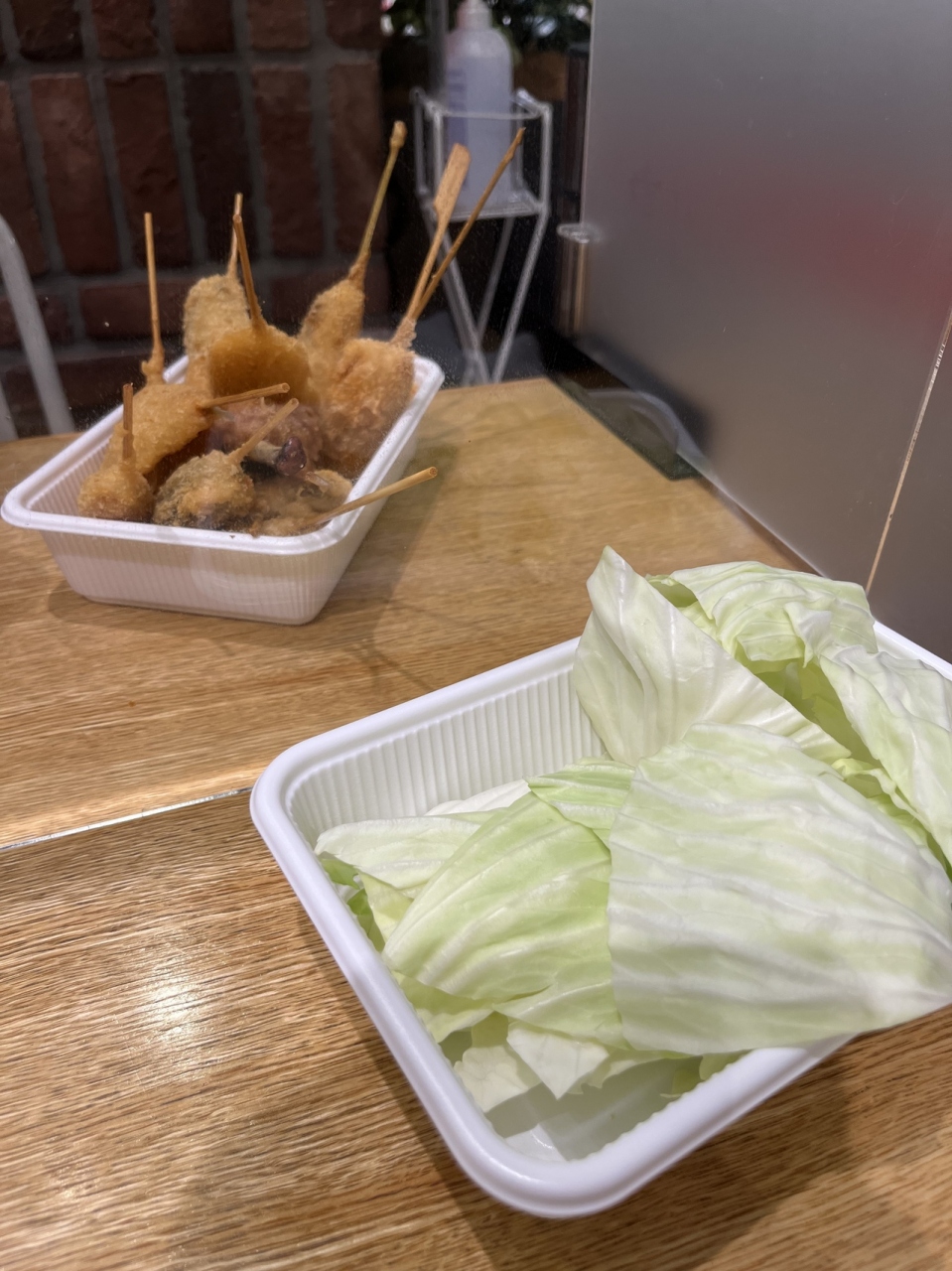カウンターと椅子席とありました。疲れていたので椅子席に座ってしまいましたが、カウンターの方が串カツという雰囲気があると思いました。初めて食べた大阪の串カツ、とても美味しかったです。- 旅行時期