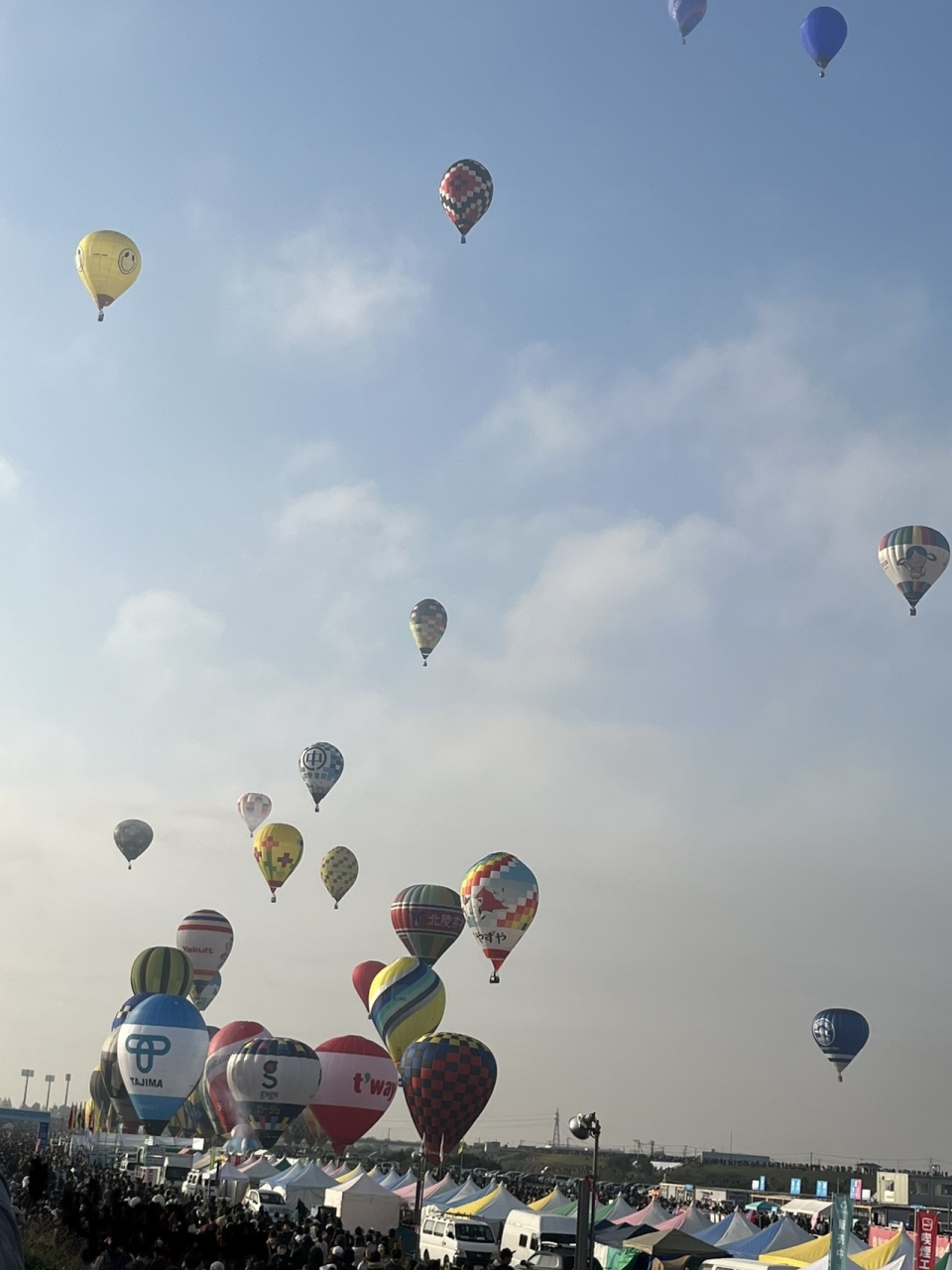 佐賀インターナショナルバルーンフェスタは佐賀県の嘉瀬川河川敷周辺で行われる熱気球の大会です。バルーンさが駅という臨時の駅ができて、そこからみにいけます。