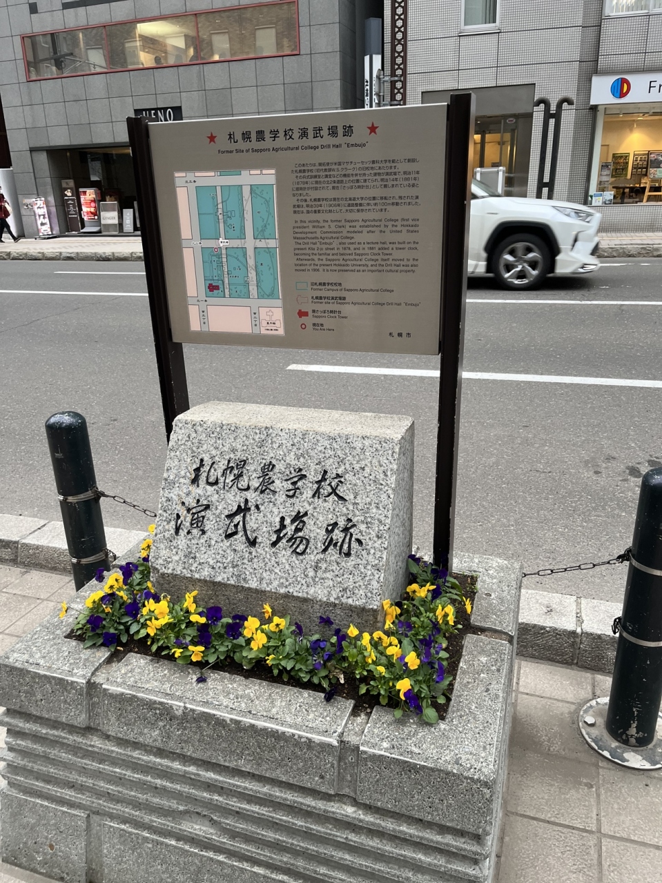 札幌農学校演武場跡碑は、北海道札幌市中央区北1条西2丁目にありました。この碑によると、こちらに札幌時計台があったそうです。札幌農学校はとても広かったそうです。