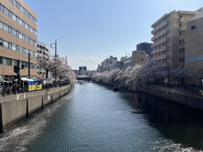 大岡川沿いに桜の花が咲いていてとてもきれいでした。橋から見る桜の景色は圧巻!横浜市の桜の名所となっているそうで、たくさんの人が歩いていました。お店も出てました。