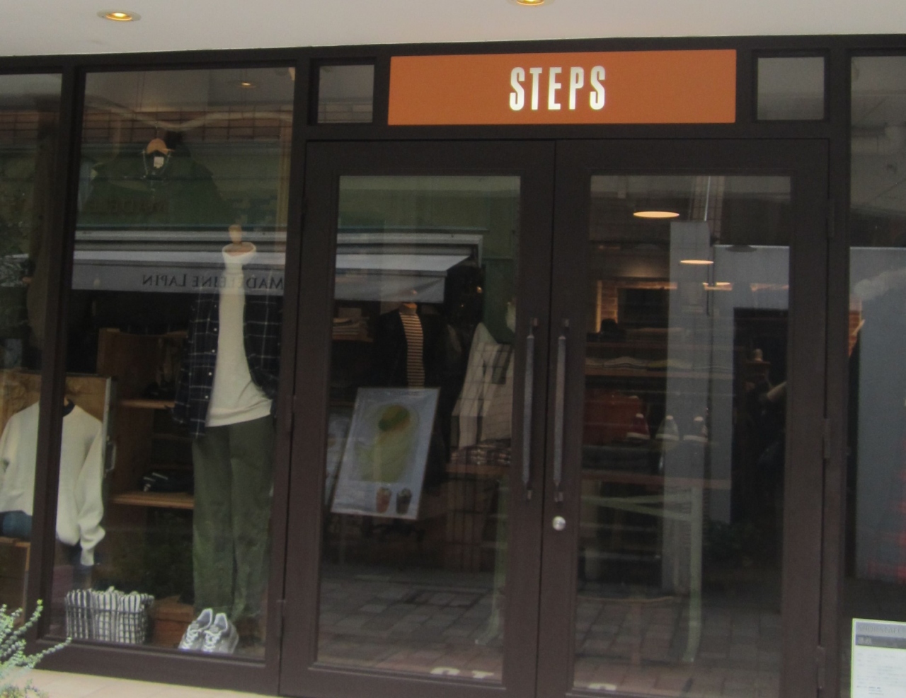 STEPS (自由ヶ丘店)は、東急自由が丘駅正面口から北西のほうへ行ったところにあるお洋服のお店です。BASICでも古くない、カジュアルというかんじのお洋服が売られていました。メンズもののお店のようですが女性も着られそうに思います。