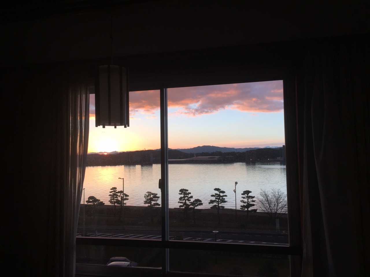 宍道湖が見える部屋に宿泊しました。宍道湖は夕陽が有名ですが、部屋からみる日の出も素敵でした。