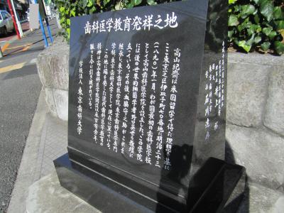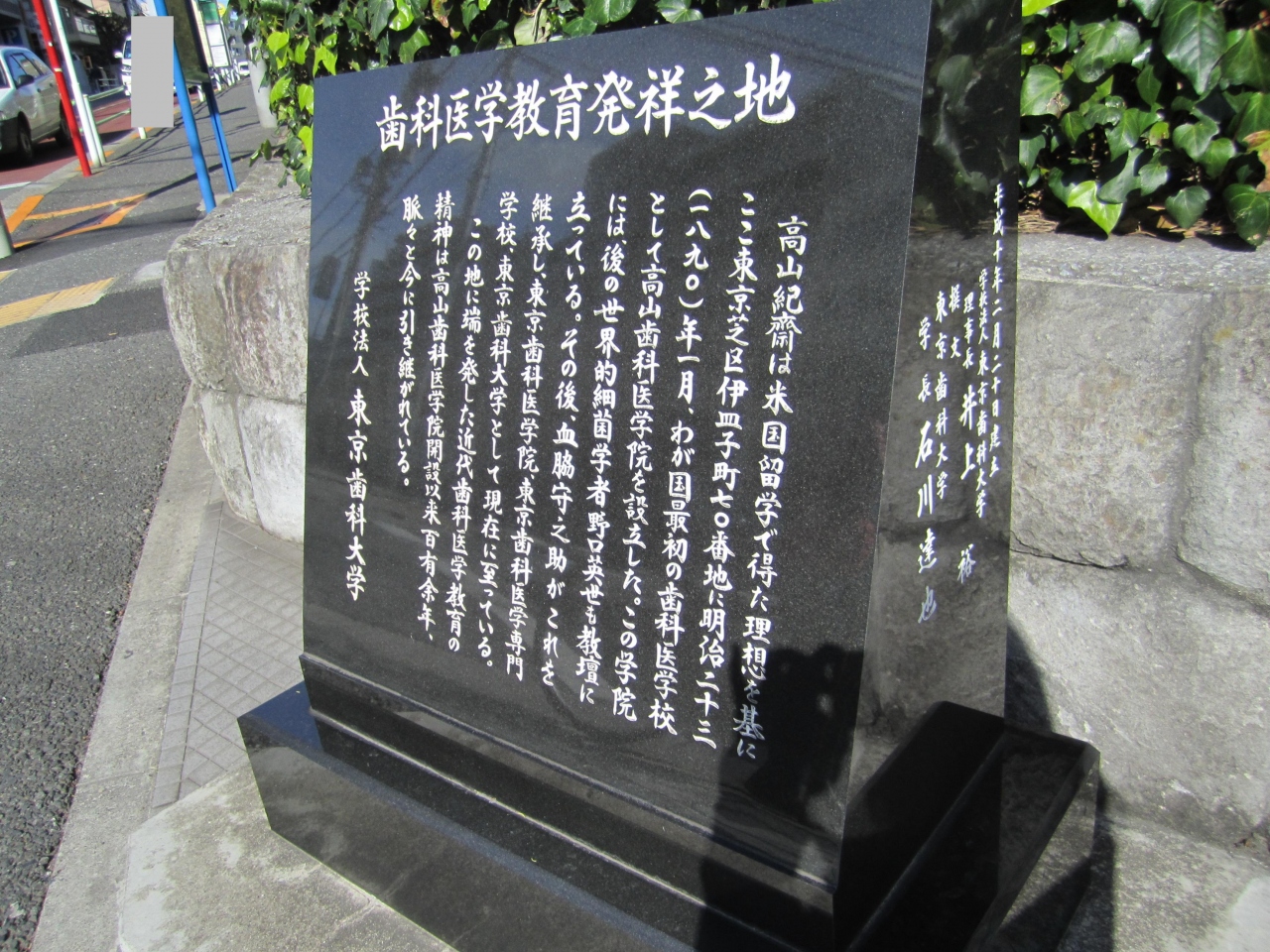 歯科医学教育発祥之地 の碑は、東京都港区三田4丁目 伊皿子坂を登ったところにあります。ピーコックのある交差点のところです。