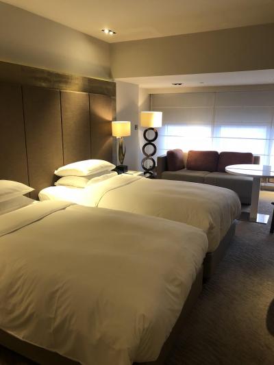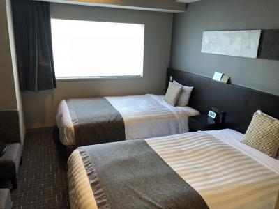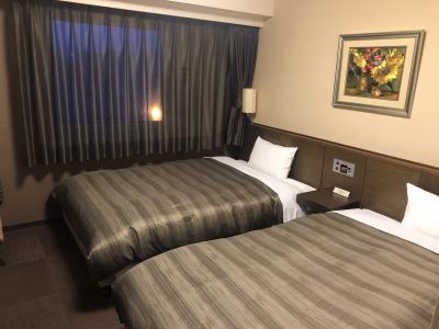 繁華街にあるので、買い物や飲みに行くには最高の場所。西日本豪雨災害の影響があったのだろう、直前予約だったが割安で、しかもアップグレードしてくれて、上の方の階の角部屋のツインをいただいた。