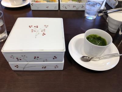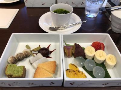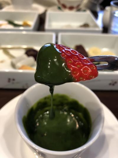 情報誌で紹介されていた「祇園フォンデュ」(税込1512円)を注文。重箱風の陶器の入れ物2段に、フルーツや各種お菓子が入っていて、それを抹茶ソースにつけていただくスタイルです。