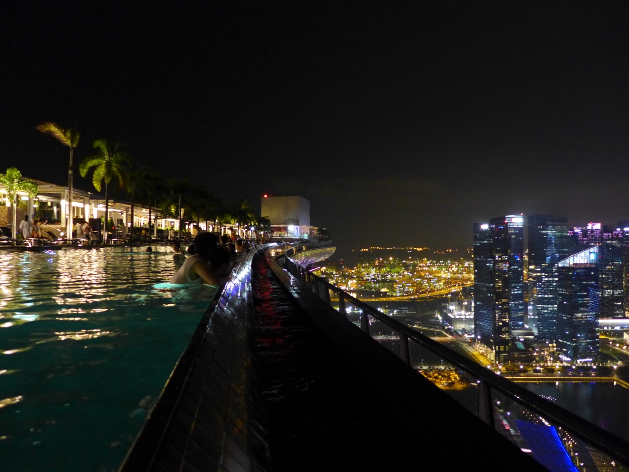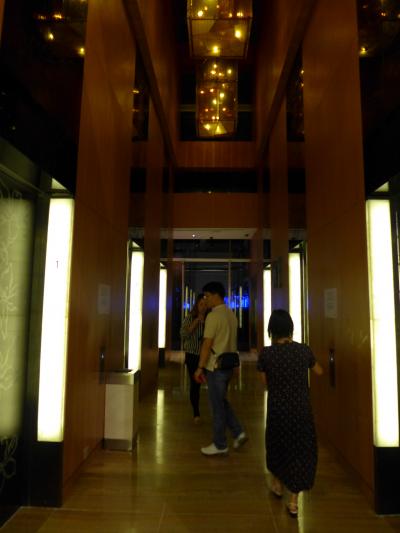 このホテルの売りの一つ、屋上プールには夜に行きました。これもやはり話のタネとしては一級品でしょうね。夜景を見ながら楽しむプールなんて滅多にないでしょうから。唯一の難点は、プールへのアクセスやタオルの有無など、プール利用についての案内が部屋になくて困りました。プールへのアクセスはタワー1かタワー3の高層階エレベーターを使わねばならず、タワー2だと一度ロビー階にまで降りねばならず不便でした。また、部屋のカードキーを1枚だけ持ってプールに行ったところ、ルームキーが入場券代わりになるようで、同行した妻の分を取りに一度部屋まで戻る羽目に。このあたりをもう少し親切にしてもらえるともっといいと思いました。ルームサービスなどについては日本語の案内がちゃんとあるのですから(苦笑)。ちなみにタオルはプールのコンシェルジュにあって自由にもらえますから部屋から持って行く必要はありません。また、ドレスコードのあるホテルなのに、水着の上から部屋にあるガウンを羽織るだけでロビーを横断していく人たちが大勢いました。ちょっとかっこ悪いのです。私たちは簡単な着替えを持って行き、夜だったので暗めのプールサイドでサッと着替えてしまいました。