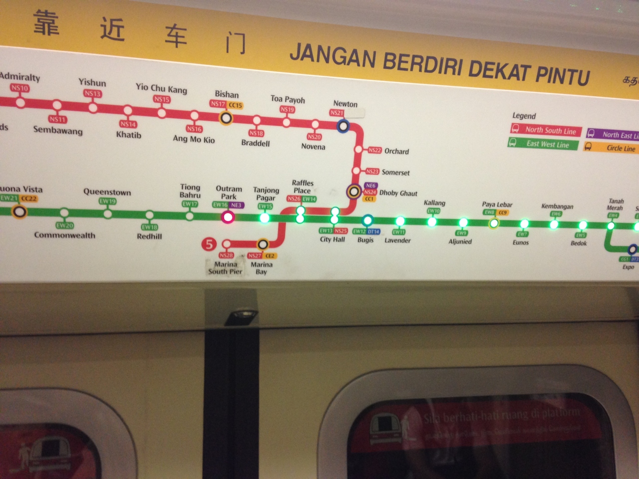 セントーサ島から市街地へ、そして市内をグルグル廻るのに使いました。路線ごとに色分けされてて、しかも3分おきくらい列車が来るので実に快適に使えます。コストも安いと思いますから、鉄道大国に住む日本人なら便利に感じると思います。