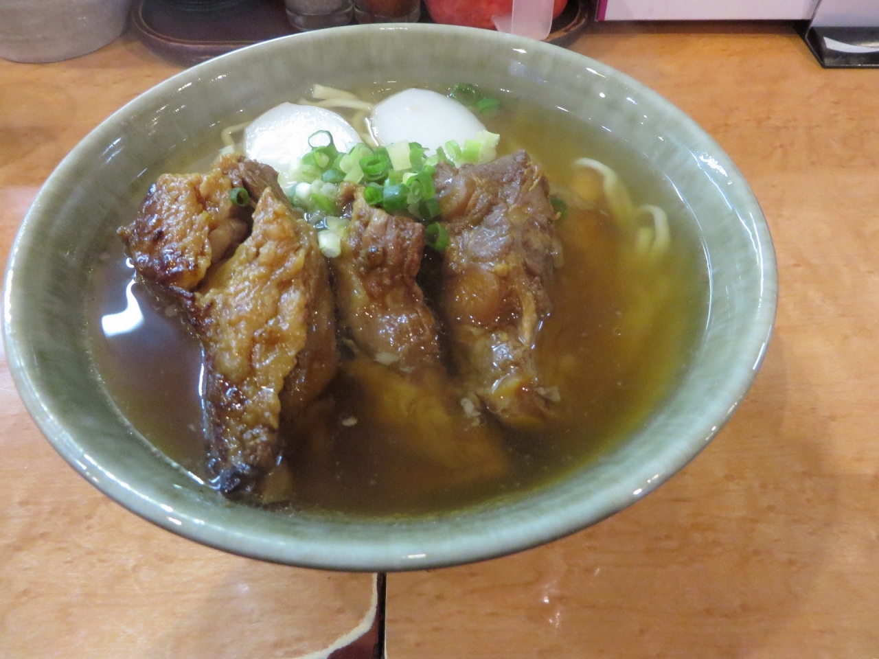 JR新宿駅東口と西武新宿駅の中間ぐらい、スタジオアルタの裏手にある沖縄そばのお店。沖縄そばのほか、各種チャンプルーなどを扱う。ソーキそばを注文。スープはやや濃いめ。大きなソーキ(軟骨ではない骨もあり)の煮つけが3個乗る。