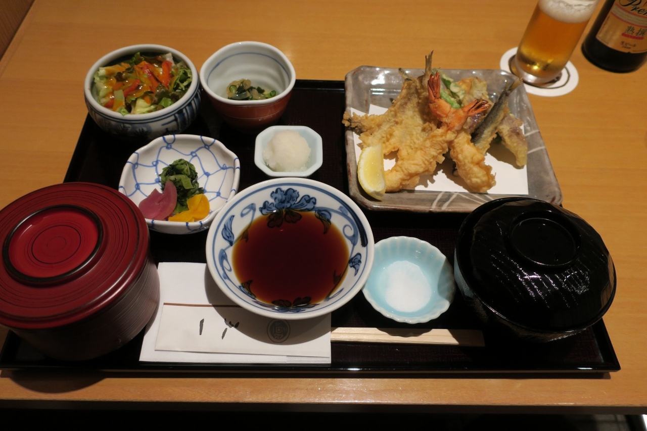 コロナの影響でほとんどの店が営業していない中で、数少ない営業店。そばメインのチェーン店だが、天丼のほか天ぷらを中心としたメニューも扱う。ランチ時に「特上大海老天丼」を注文。名前の通り、大きいエビ天が2本のほか、天ぷらが載る。天丼のたれは別添えになっており、サクサクの食感と、たれのしっとりした食感どちらもたのしめる。