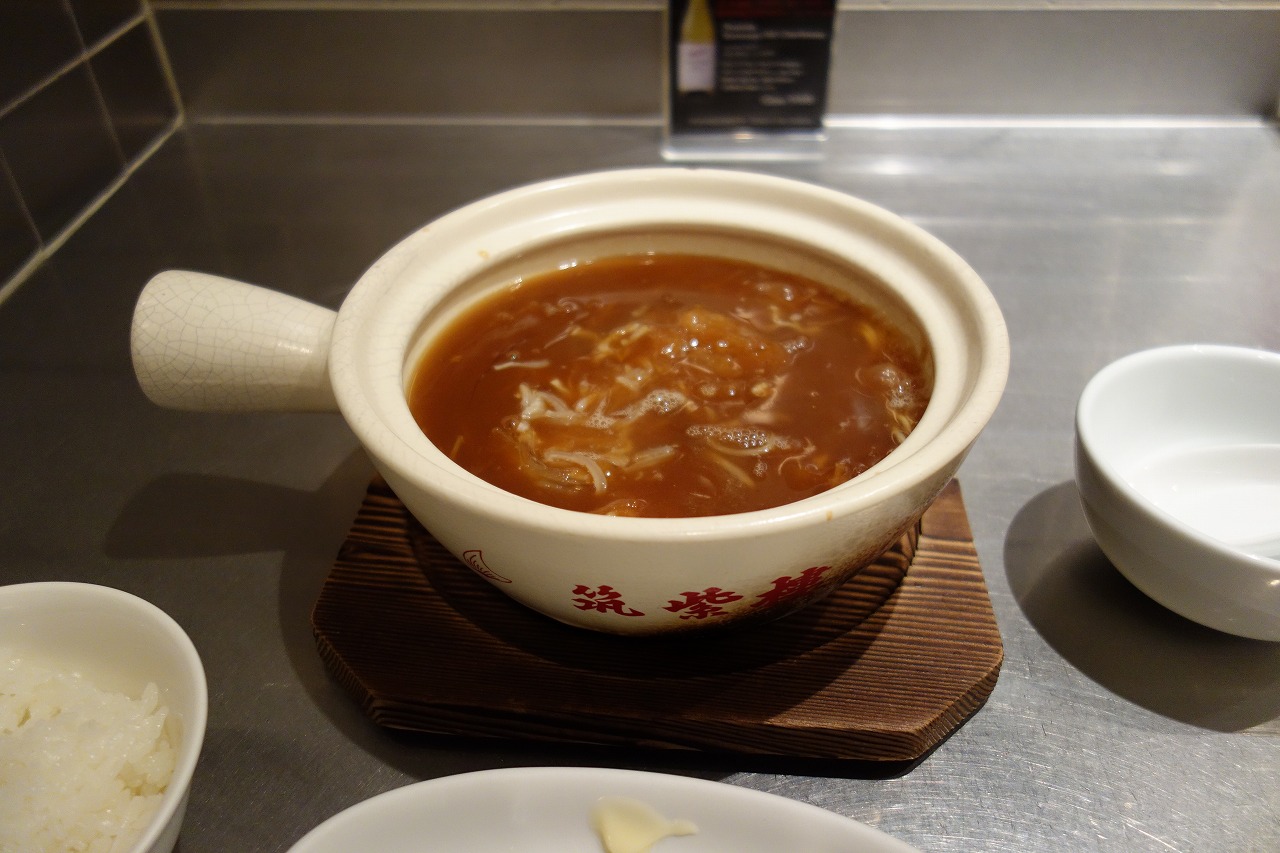 東京駅でランチ時に利用。店の名前にもなっているフカヒレ煮込みつゆそば「頂上麺」のセットを注文。麺が来る前にエビのマヨネーズ和えが出てくる。揚げたてのエビがおいしい。つゆそばと、ライスが一緒に出されるので、つゆそばのみで食べるもよし、スープとフカヒレをライスに載せるもよし。