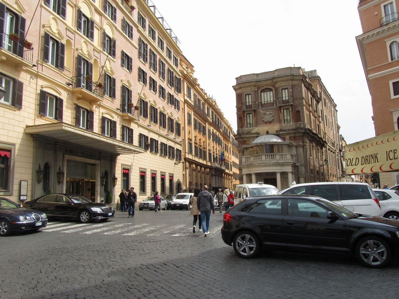 スペイン階段の真上にあるインターコンチネンタルホテル。となりは高級ホテル・ハスラー。近くのスペイン階段の上からはローマ市街を見渡せる。スタンダードルームだとバスタブがない部屋もあるので高級ホテルとはいえ注意が必要。
